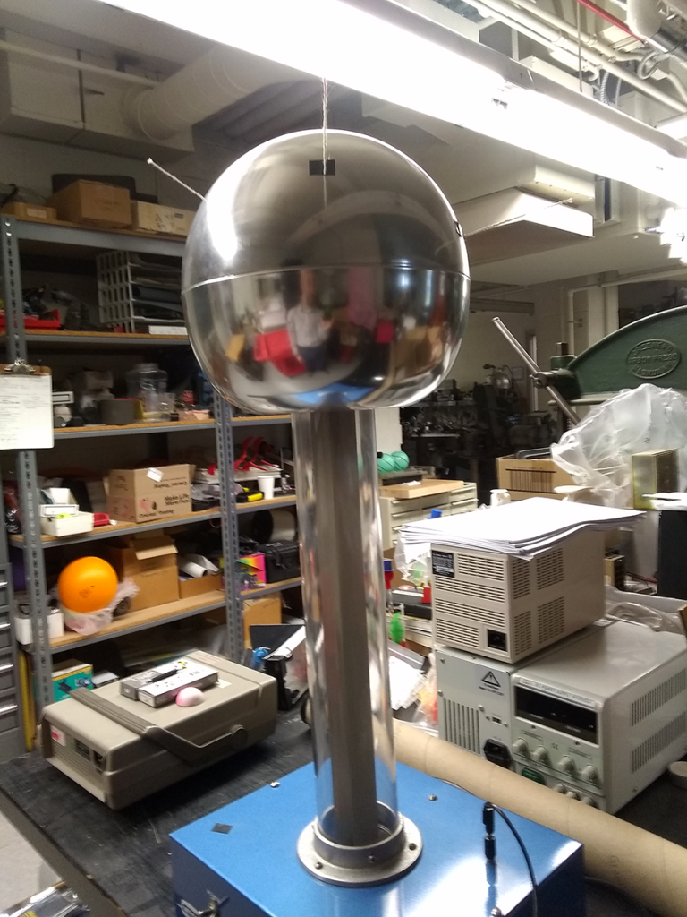 The spring semester PHYS 212 course starts with electrostatics, and what could be more entertaining than a Van de Graaff generator? A whirring rubber belt on two different rollers – one acrylic, the other covered in dense wool – builds up an electric charge on the anodized aluminum dome. The air positively crackles, and the discharge arcs look pretty great in a dark room.